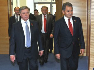 Под звуки Губернаторского оркестра Сергей Шойгу и Борис Громов вместе вошли в концертный зал и заняли свои места.